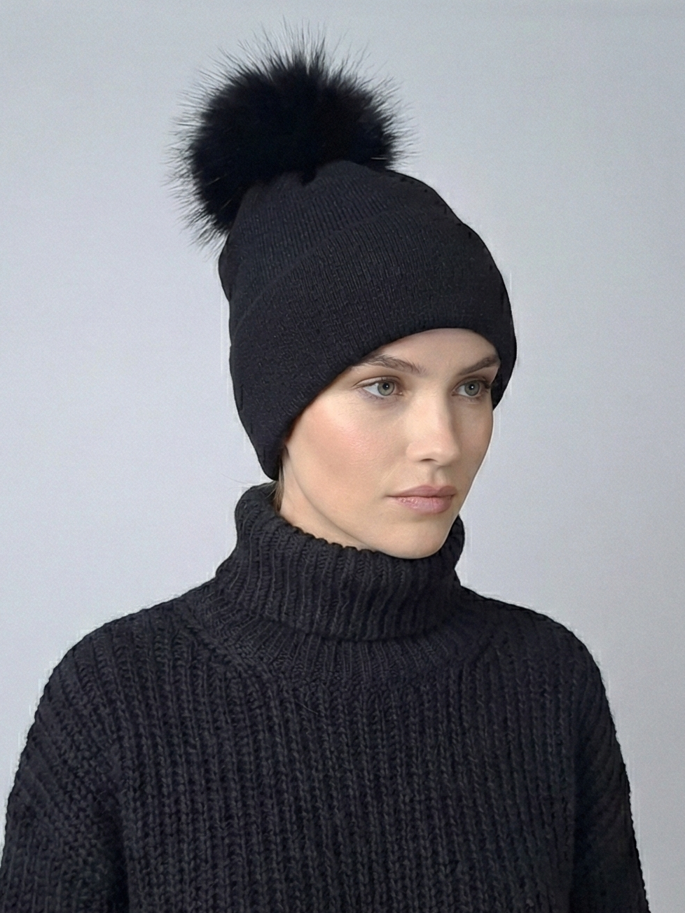 Praktisk garnmössa med en blå räv pom pom ovanpå.��