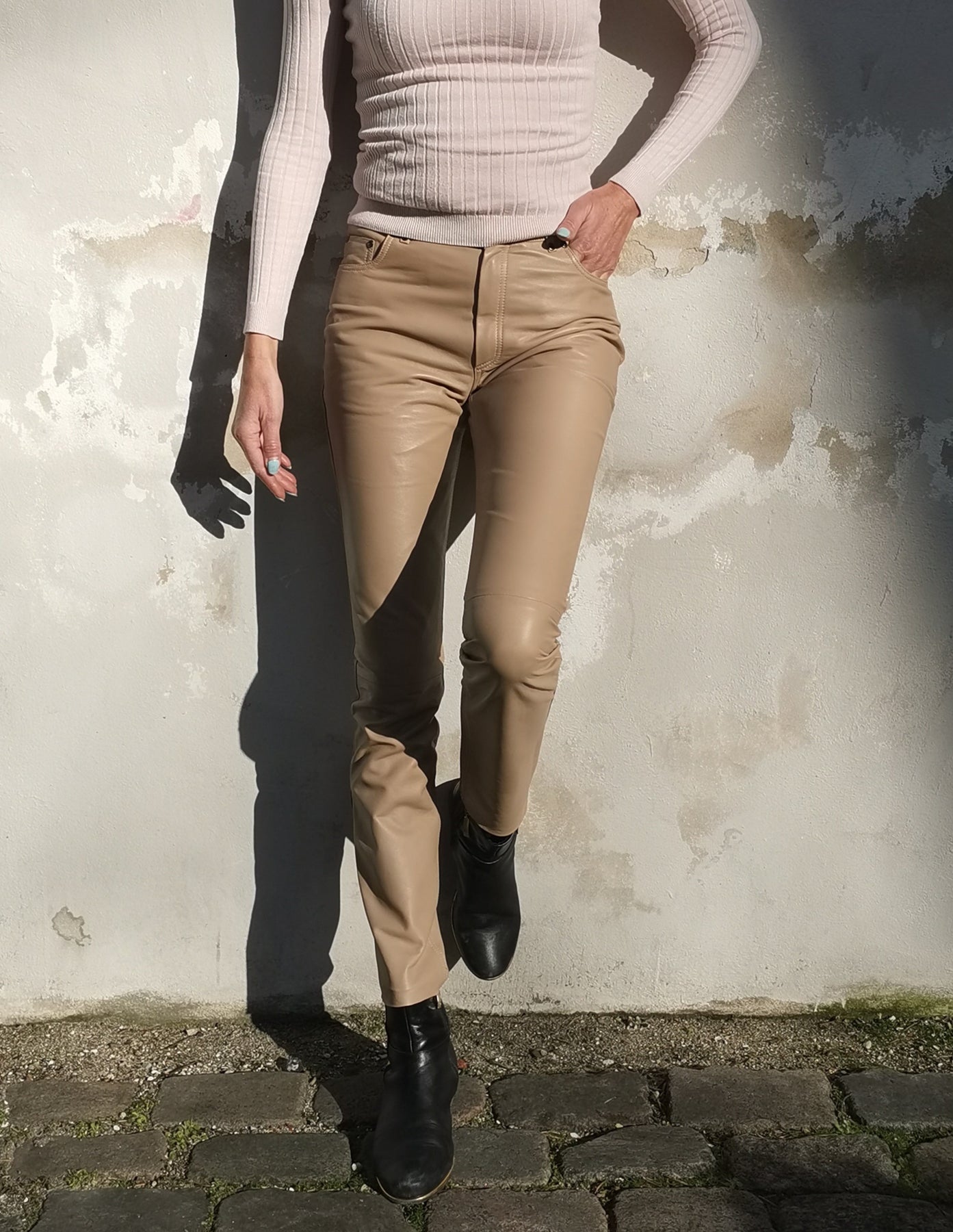 Upplev den perfekta blandningen av lyx och avslappnad stil med New Jill Trouser i beige lammnappaläder. Dessa byxor är utformade för att spegla den klassiska jeansformen och erbjuder en smickrande passform med en mjuk, smidig konsistens som lyfter vilken outfit som helst. Idealiska för dem som vill ha kanten av läder med förtrogenhet med dina favoritjeans, de kombinerar komfort och sofistikering utan ansträngning. Gå ut med självförtroende i detta tidlösa plagg designat för att förbättra din garderob med en modern, chic touch.
