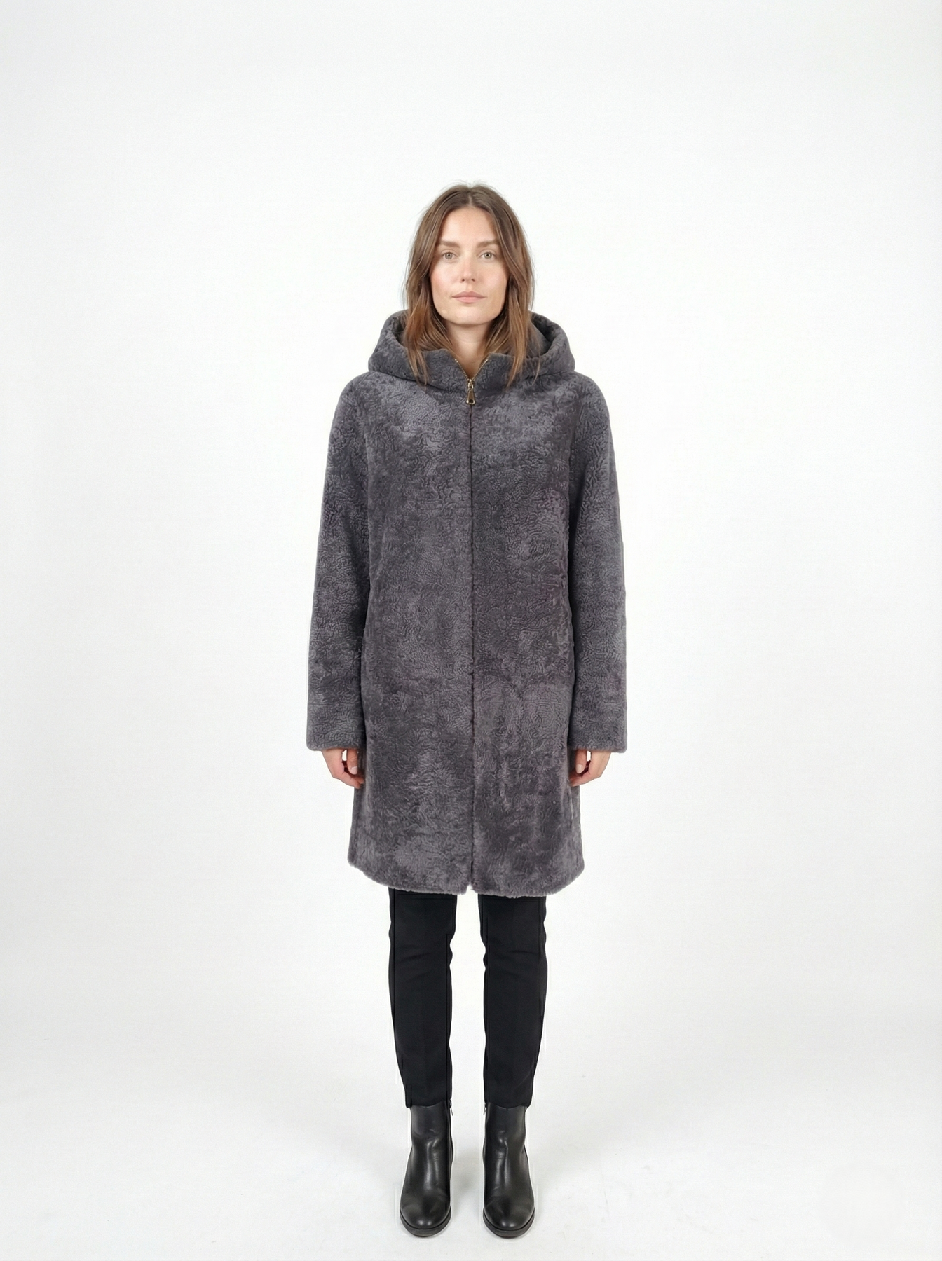 En lammeskindsjakke med hætte, der er fastgjort med en robust sølvlynlås, kombinerer både stil og funktionalitet. Det bløde og luksuriøse lammeskind giver jakken en raffineret og indbydende følelse. Hætten tilføjer en ekstra dimension af varme og beskyttelse mod kulde.