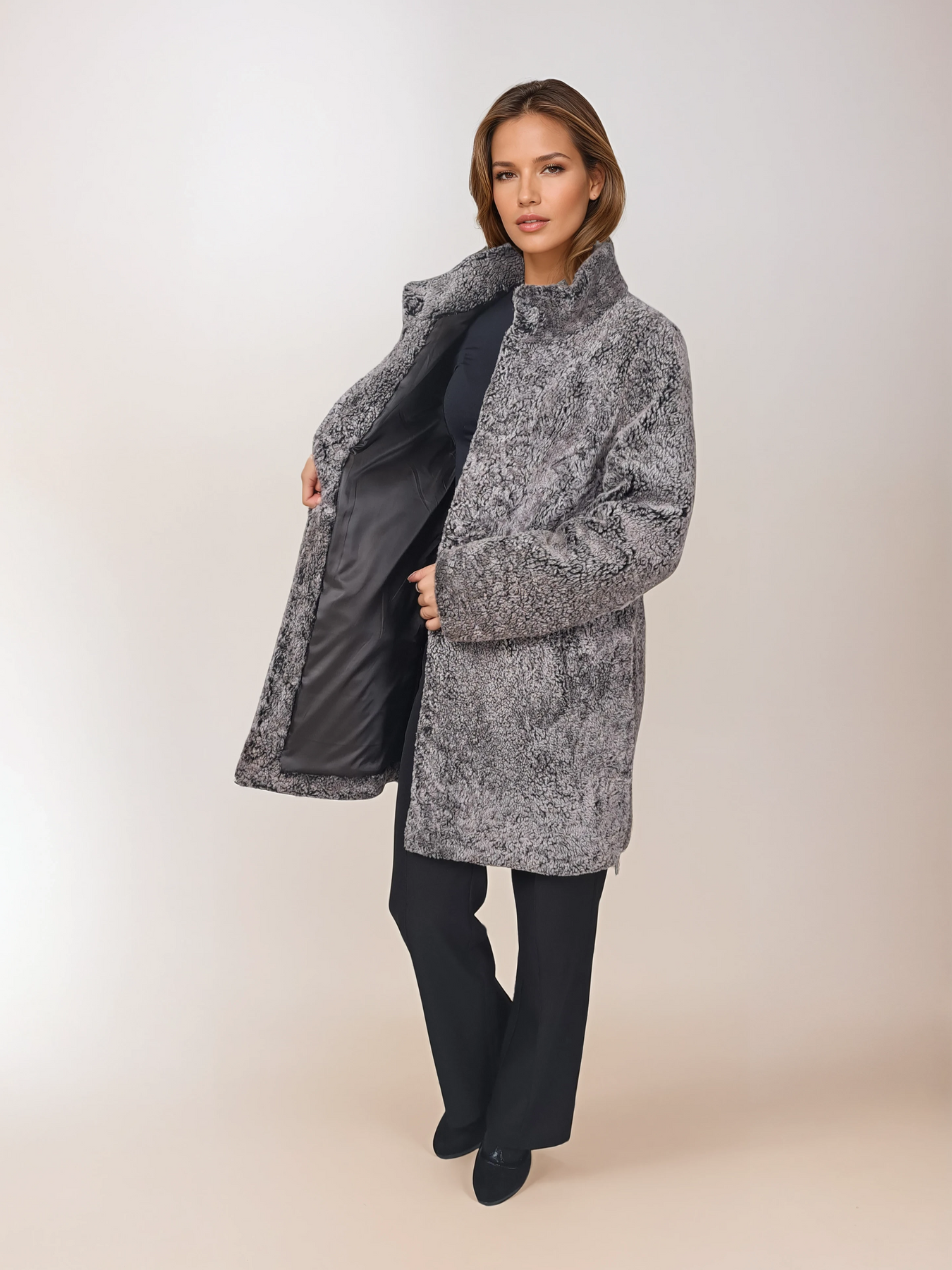 Innocente er den ultimative garderobe, der er afgørende for den moderne kvinde. Denne 83 cm frakke i mørkebrun nappa lammebrisa leverer enestående varme uden at gå på kompromis med stilen. Dens raffinerede silhuet og det luksuriøse materiale skifter problemfrit mellem sammenhænge, der er lige så hjemme under daglige ærinder eller aftener. Den sofistikerede mørkebrune nuance komplementerer enhver palette, mens den generøse længde giver elegant dækning. Et investeringsstykke, der ubesværet slår bro mellem afslappet komfort og poleret glamour.