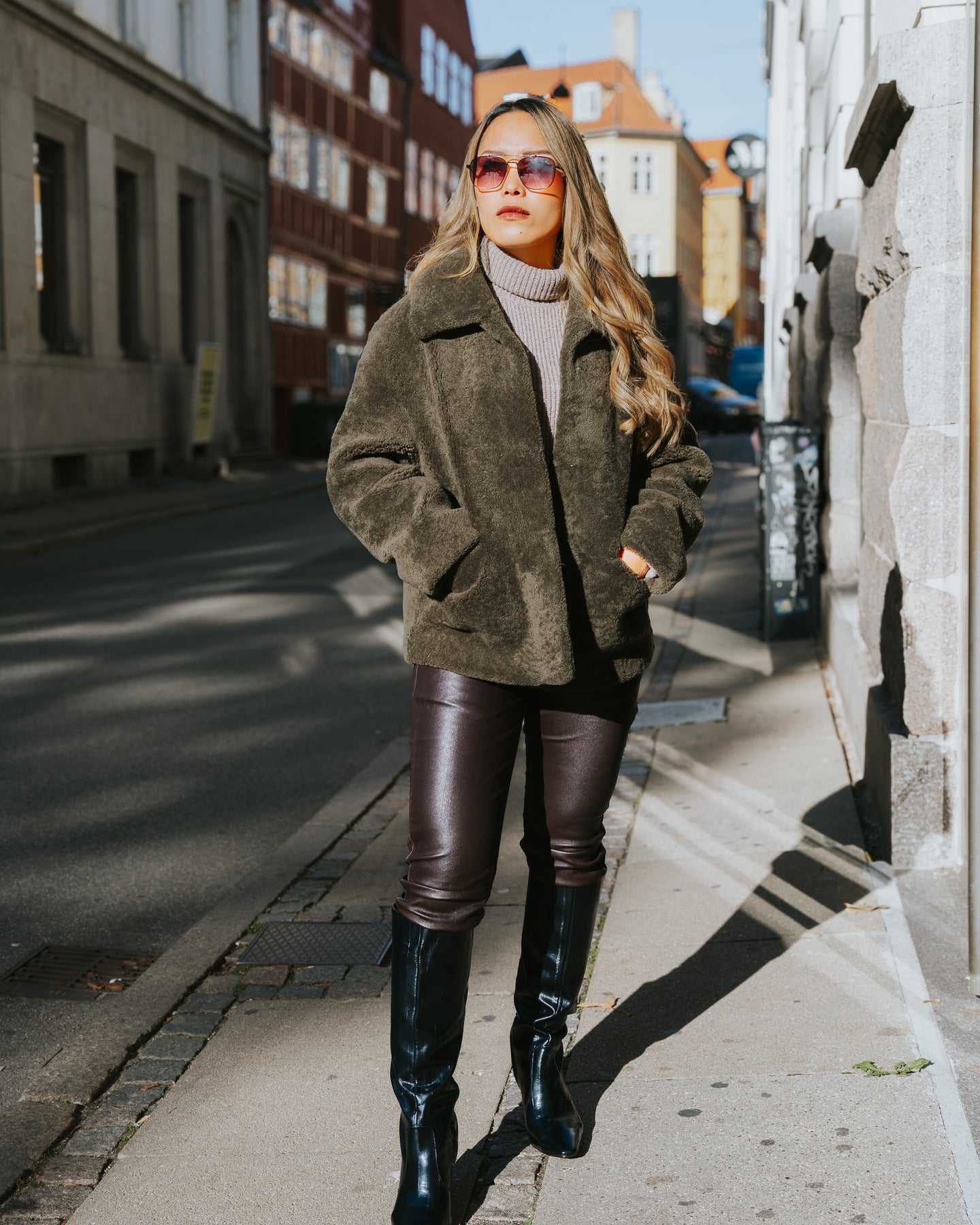 Forkæl dig med luksus med Irene, en smukt udformet 65 cm. krave til kvinder. Denne jakke er lavet af krøllet lammepels og har en normal foring for ekstra komfort. Fås i elegant army. Løft din stil med Irene by Levinsky!