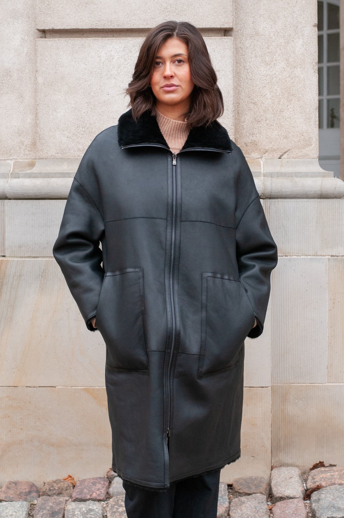 Omfavn alsidig luksus med denne udsøgte vendbare shearling frakke. Denne frakke er lavet af førsteklasses dobbeltsidet lammeskind og tilbyder to forskellige looks i ét. Den ene side har en slank, sofistikeret nappalæderfinish i klassisk sort, mens bagsiden afslører en plys, krøllet lammepelstekstur for uovertruffen varme og en hyggelig æstetik. Designet med en høj krave og en afslappet silhuet, er det det perfekte statement-stykke til ubesværet vinterelegance, så du kan tilpasse din stil til enhver lejlighed.
