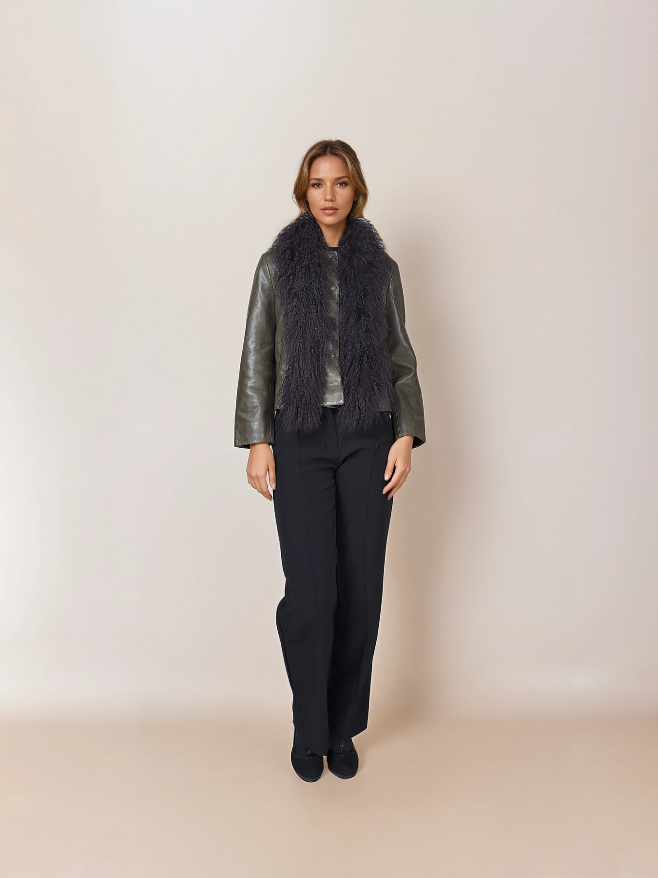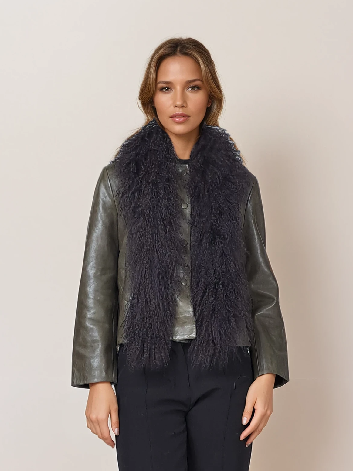 This kalgan lamb collar brings refined elegance to your neckline. Rendered in brown, it offers a versatile neutral that complements any palette. The luxurious material drapes gracefully while providing subtle warmth and texture. Whether styled as a statement piece or layered beneath jackets, this sophisticated accessory adds understated luxury to both casual and formal ensembles with timeless appeal.