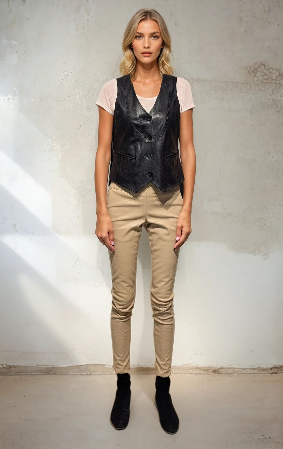 Introduktion af Tessa West Lamb Malli lædervest til kvinder i sort - en elegant og sofistikeret tilføjelse til din garderobe. Denne sorte lædervest er tankevækkende designet med fire elegante sorte knapper foran og har to funktionelle lommer, der slår den perfekte balance mellem stil og praktisk.