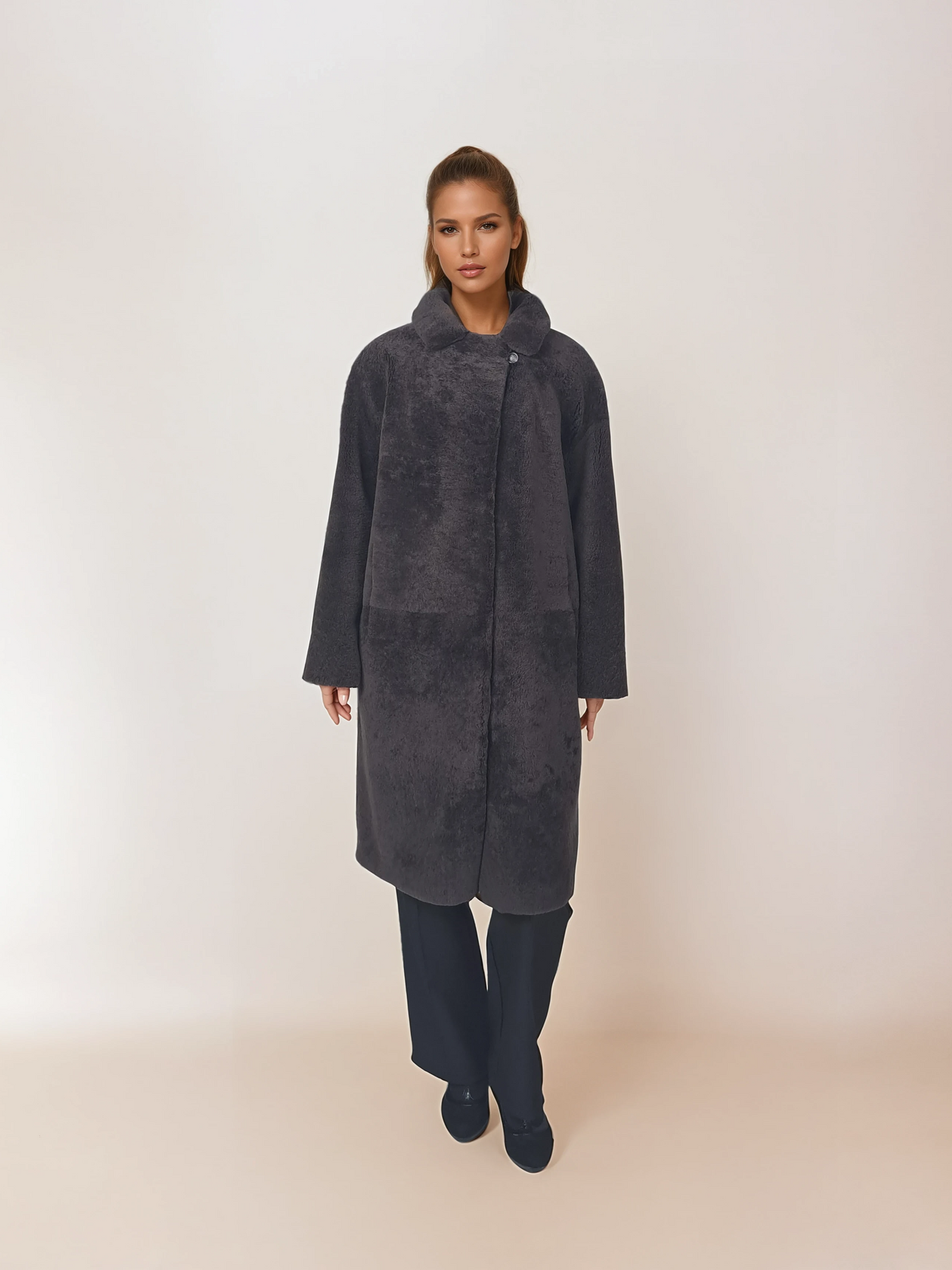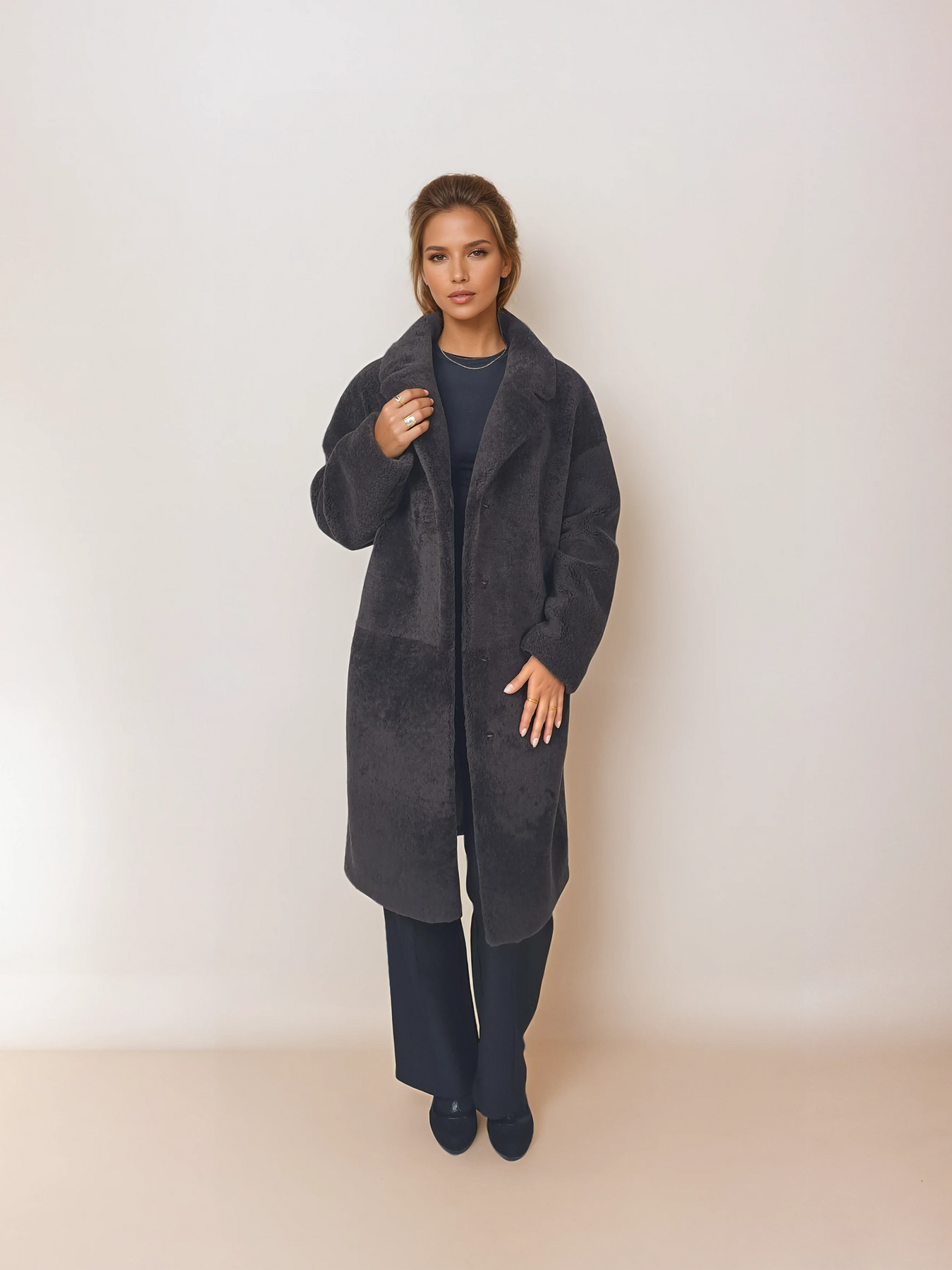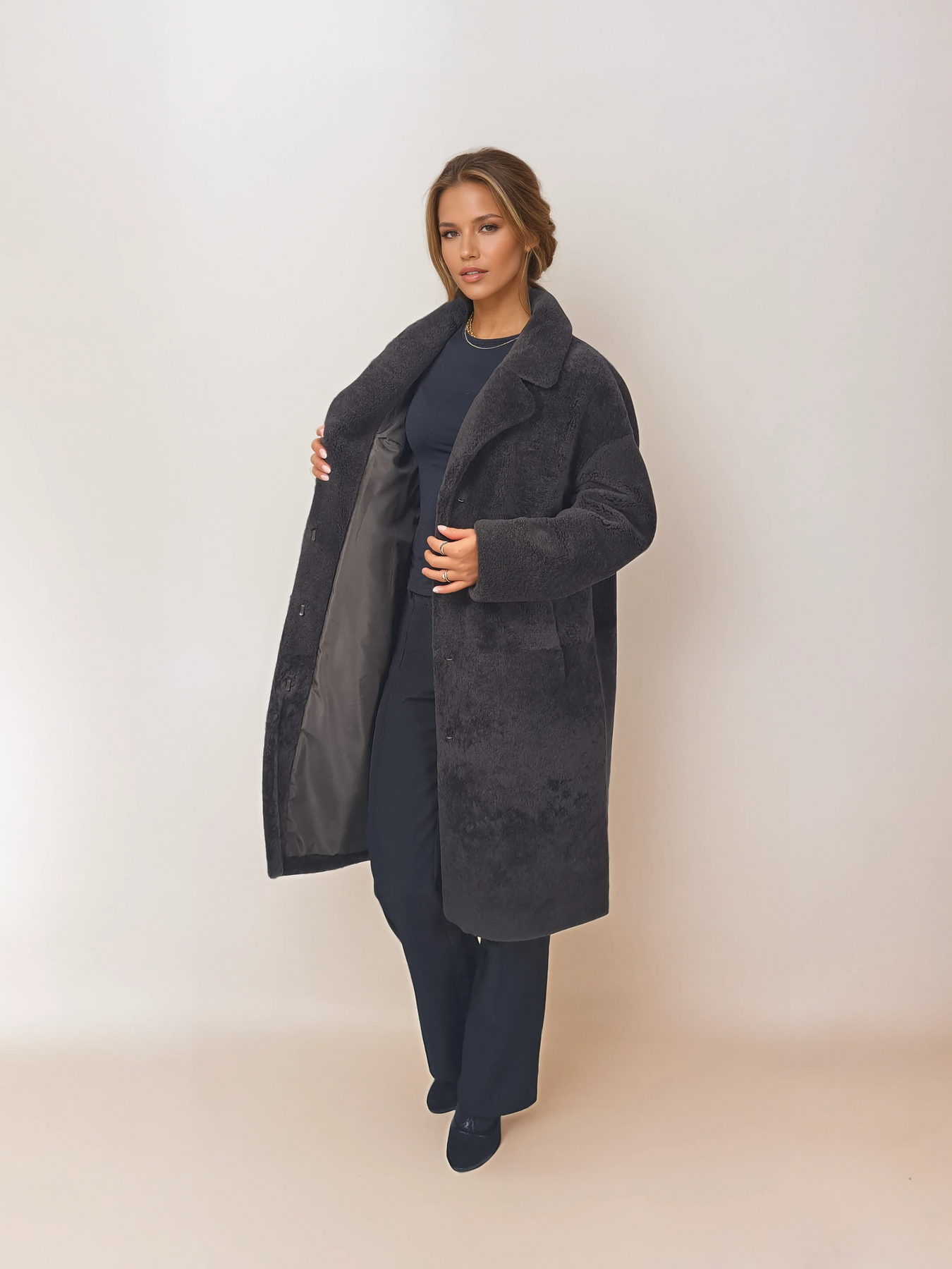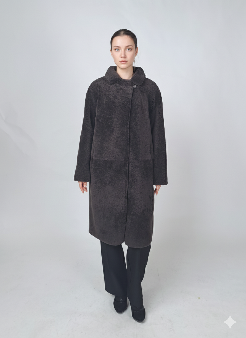 Dieser raffinierte, lockige Lammmantel für Damen besticht durch seine luxuriöse Textur in einem warmen Kaffeeton und wird durch einen eleganten Kragen von 95 cm abgerundet. Der charakteristische gekräuselte Flor sorgt für visuelles Interesse und haptische Fülle, während die raffinierte Silhouette für mühelose Raffinesse sorgt. Ein Investitionsstück, das außergewöhnliche Wärme mit dauerhaftem Stil für die anspruchsvolle Frau verbindet.