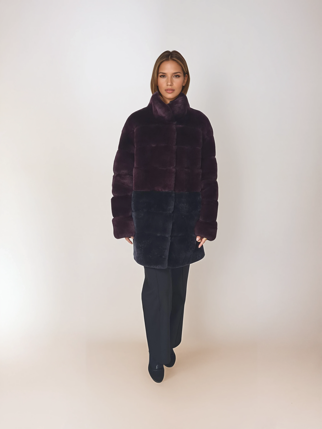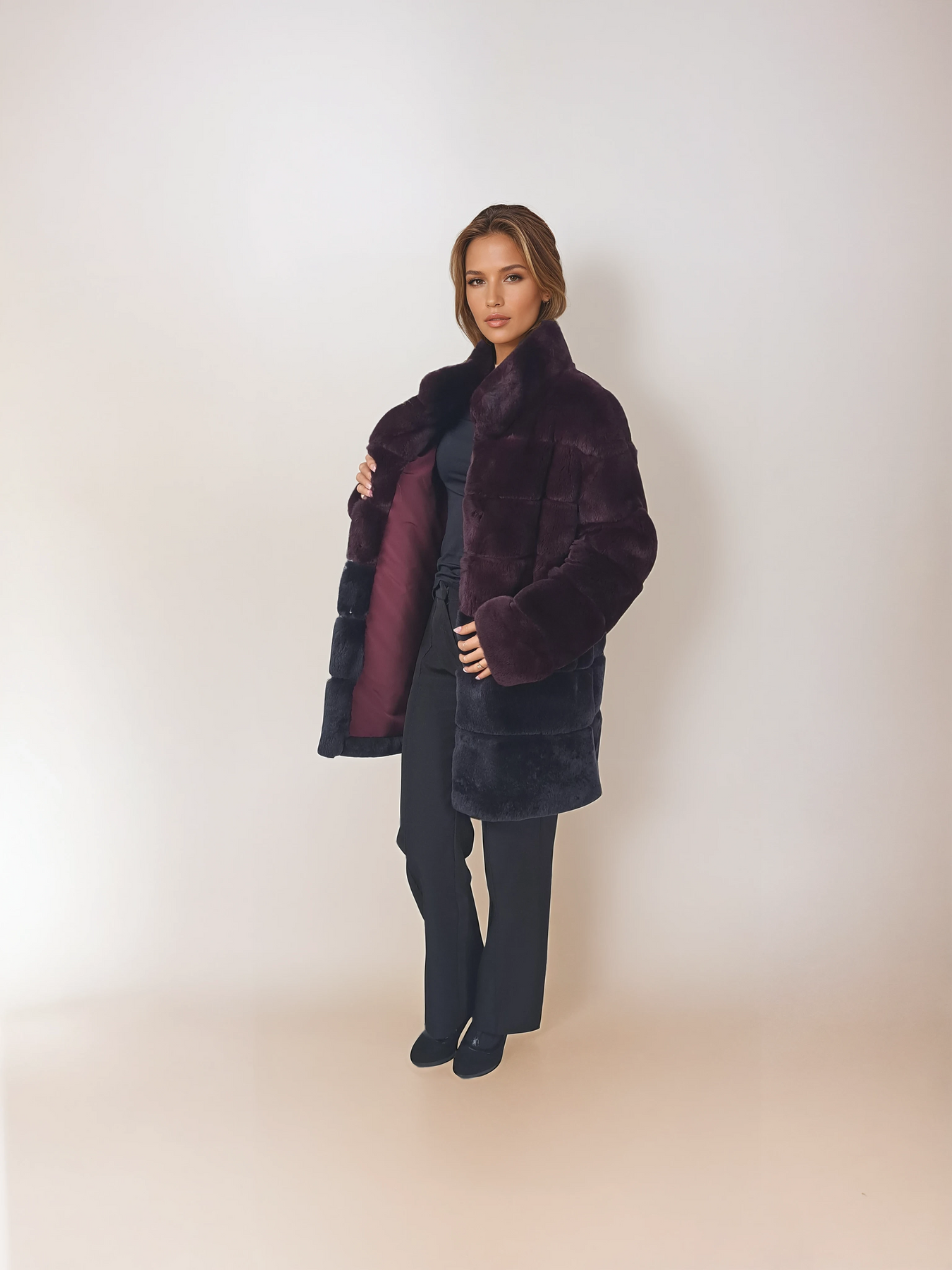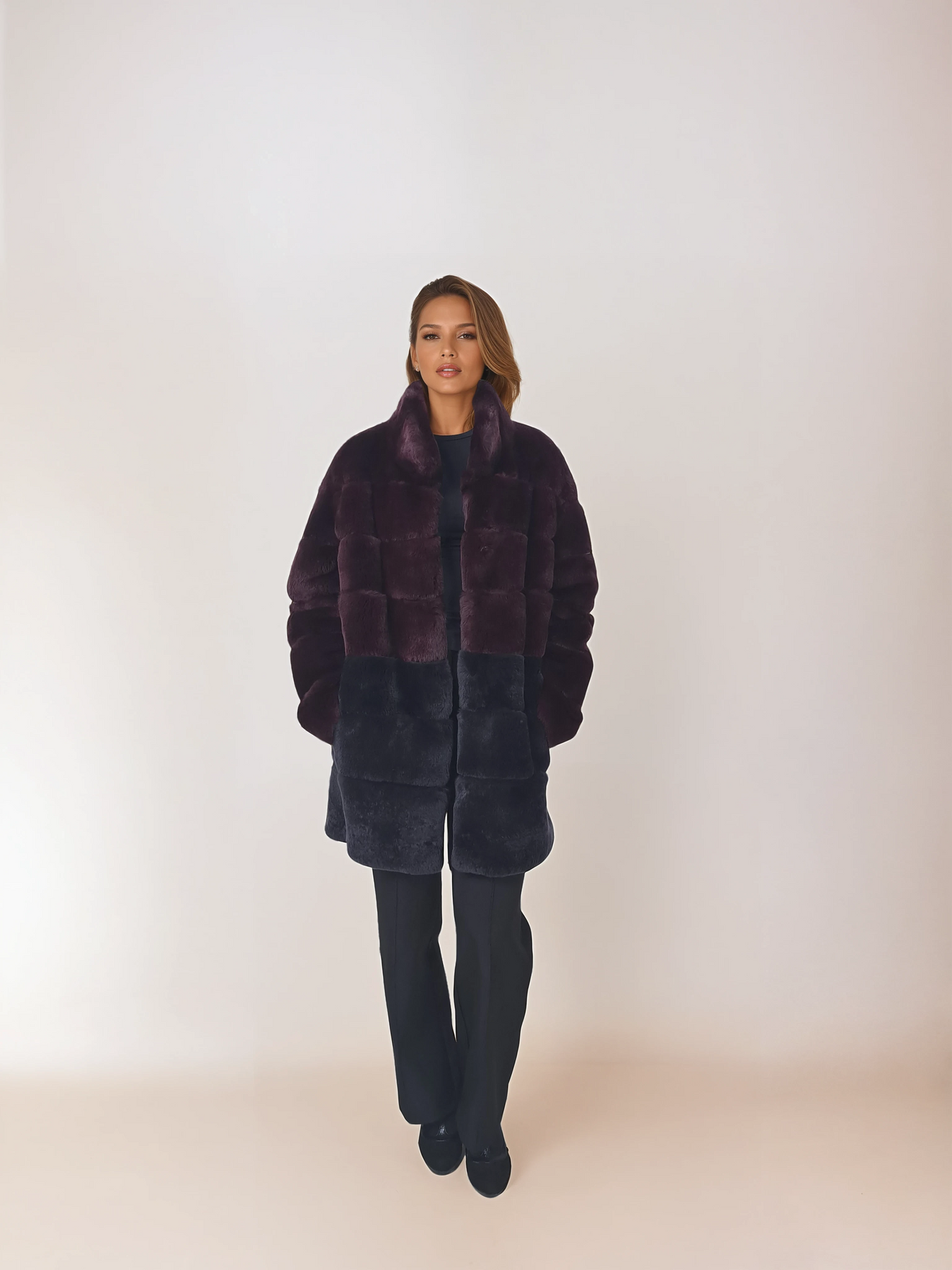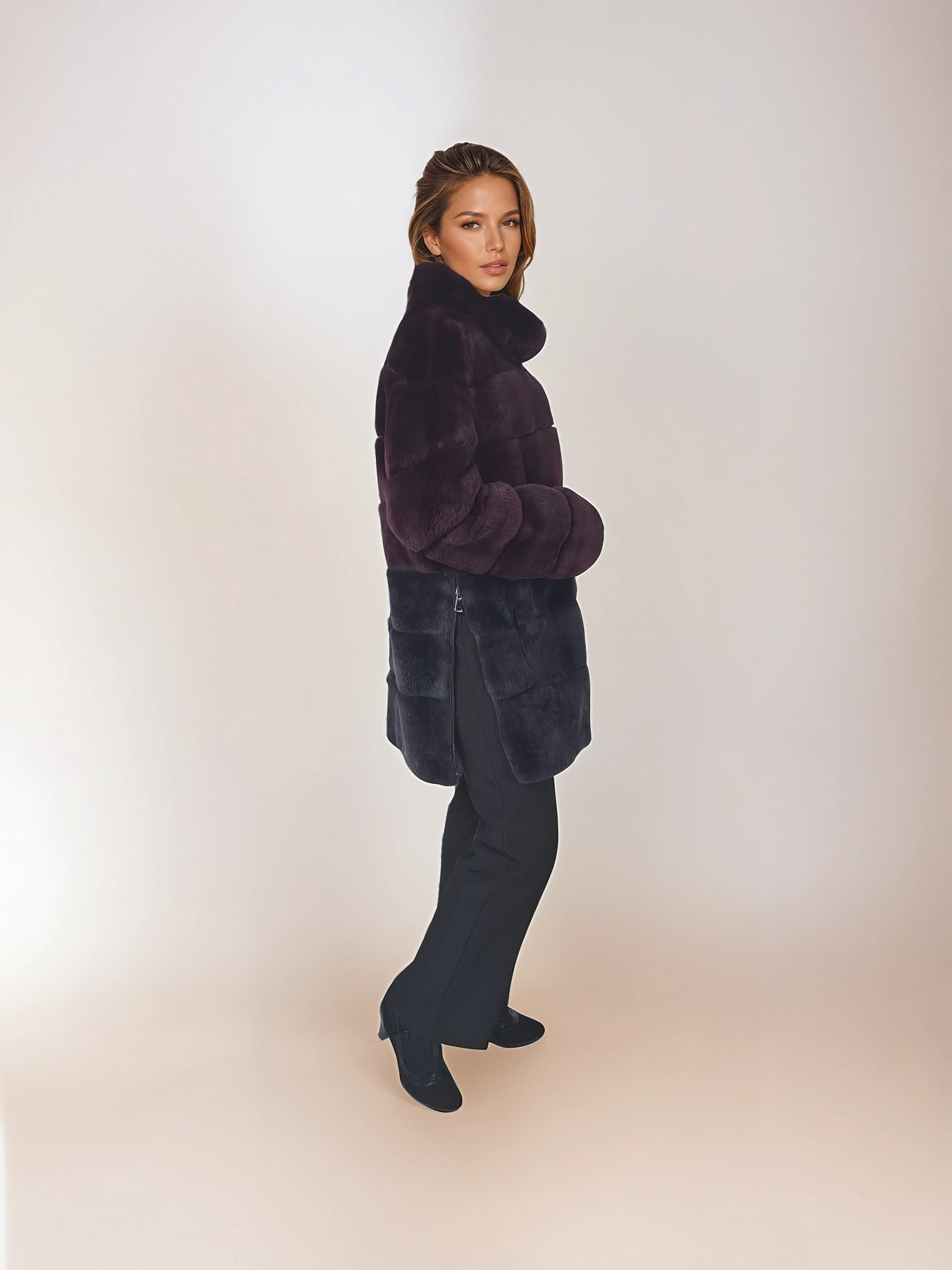 Die Hachan-Jacke präsentiert ein auffälliges zweifarbiges Design, das zeitgenössische Eleganz einfängt. Dieses 80 cm große Stück mit sanfter Konstruktion kombiniert Wein und Holzkohle in einer harmonischen Palette, die über saisonale Trends hinausgeht. Hergestellt aus Rex-Material für ein luxuriös weiches Gefühl auf der Haut, bietet es sowohl taktilen Komfort als auch visuelle Raffinesse. Mit seitlichen Reißverschlüssen für eine individuelle Passform vereint diese 80-cm-Jacke Stil und Funktionalität nahtlos. Diese Jacke eignet sich ideal für Lagen-Looks oder zum Tragen als Statement-Stück. Sie wertet das Alltags-Styling mühelos auf und behält gleichzeitig die raffinierte Ästhetik bei, die die anspruchsvolle Frau verlangt.