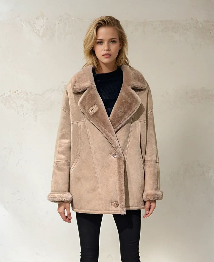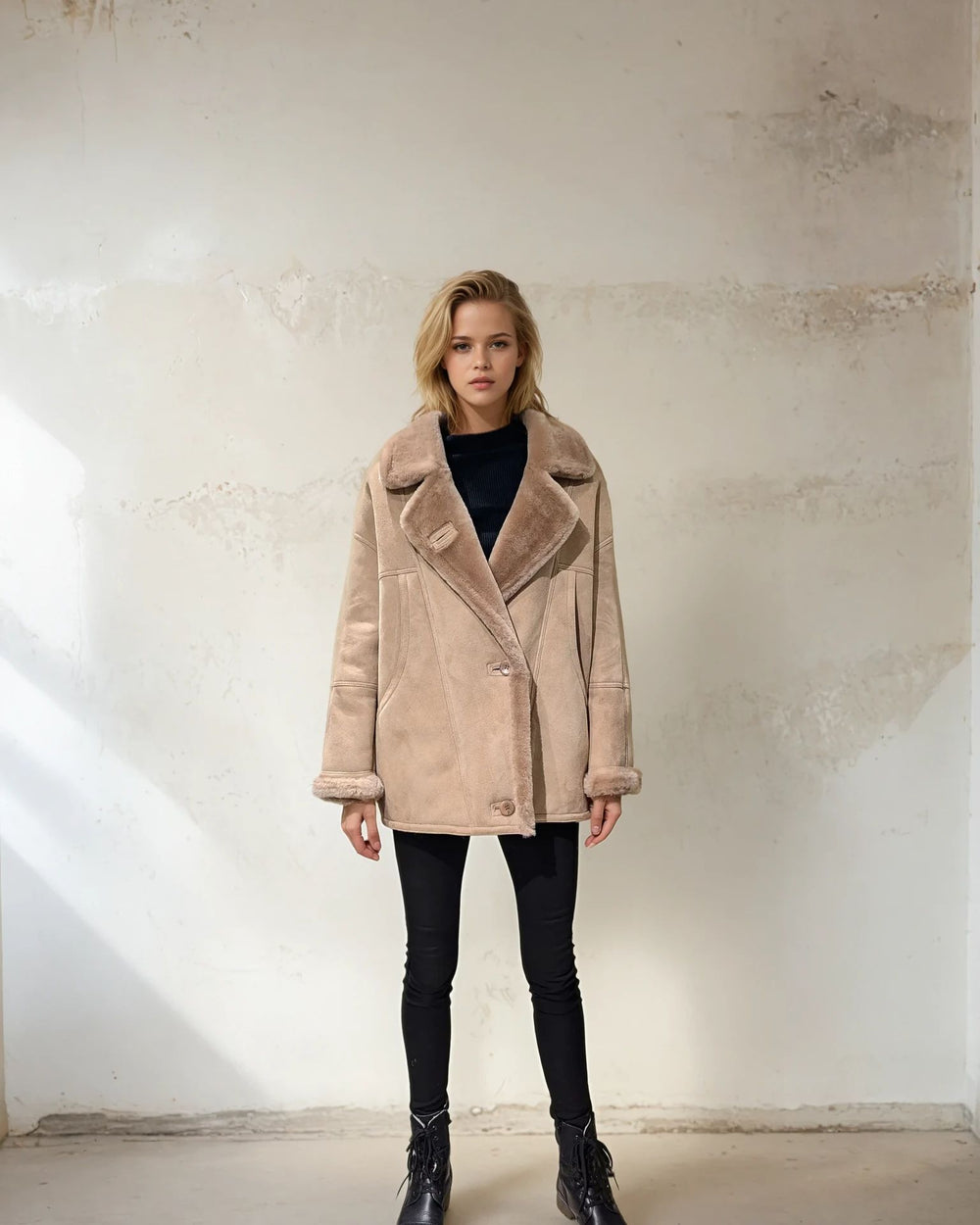 Gönnen Sie sich Luxus mit der Lammfelljacke von Hervati. Sie ist aus weichem Lammwildleder gefertigt, warm und bequem und perfekt für kühle Tage. Das übergroße Design und die hübsche Revers verleihen ihr ein edles Flair, während die Möglichkeit, den Kragen mit einem Knopf zu schließen, für Vielseitigkeit sorgt. Erleben Sie Eleganz in Oak.