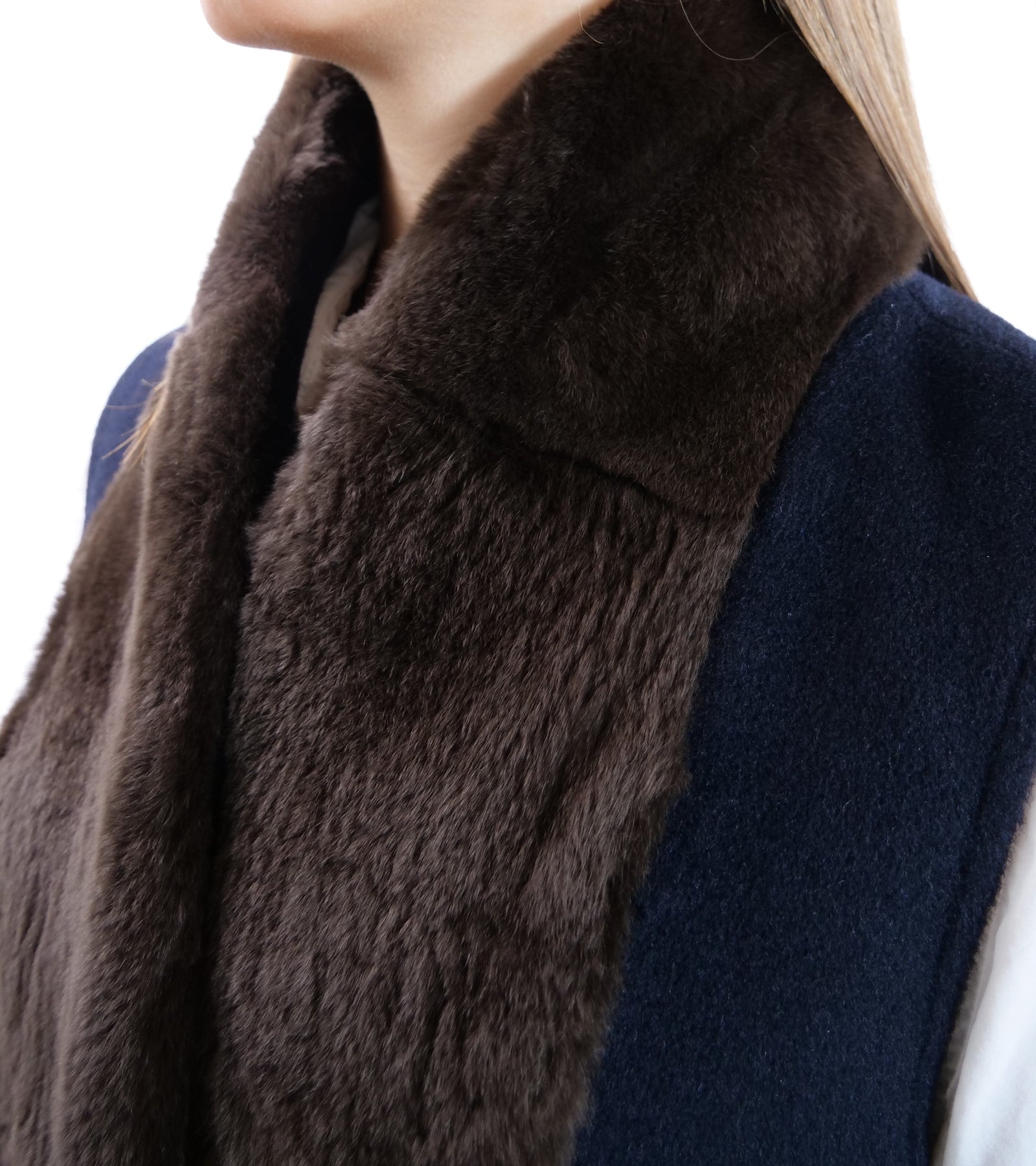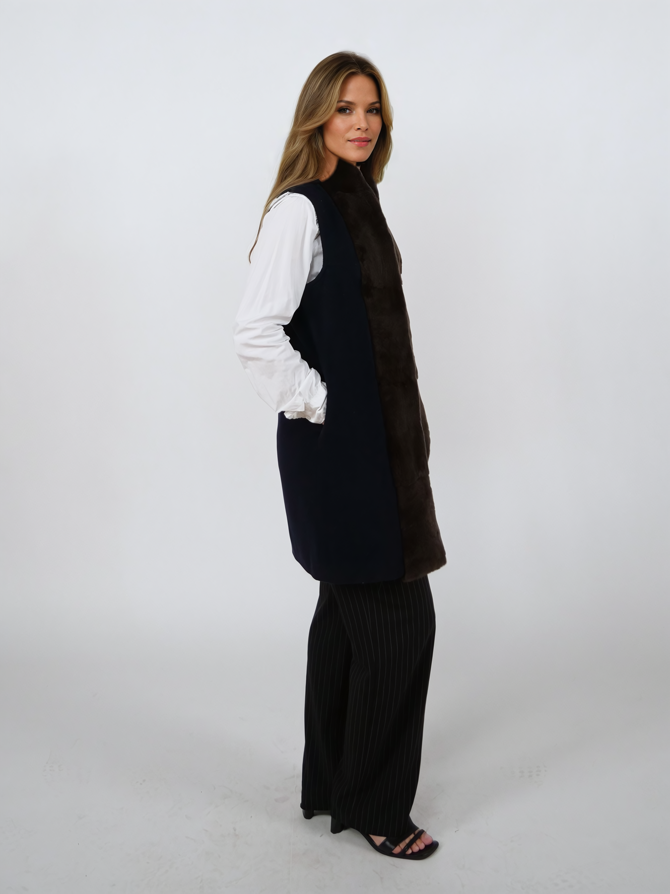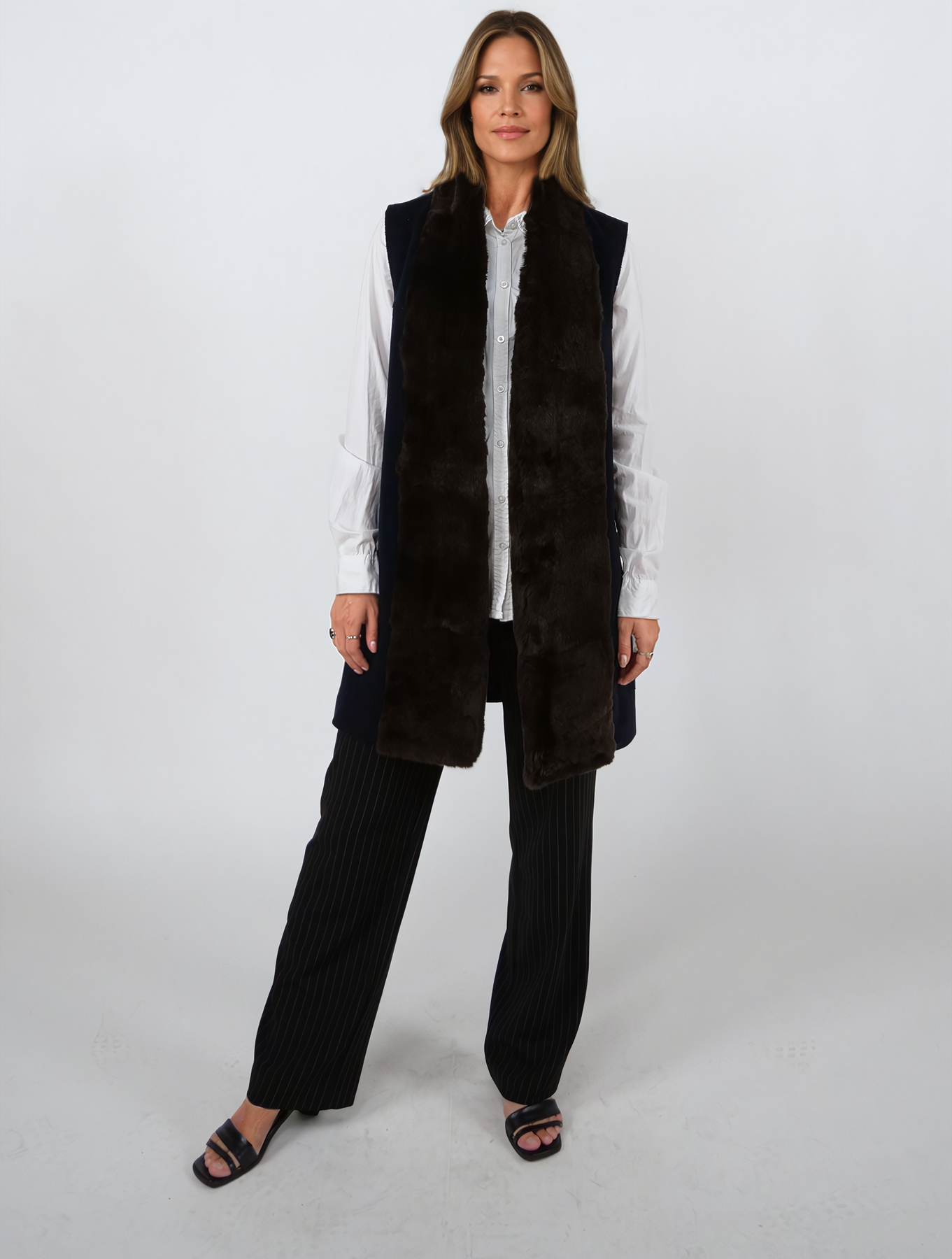 Wir präsentieren Isalyne, die luxuriöse 85 cm lange Kaschmirweste für Damen. Diese Weste besteht aus 10 % Kaschmir und ist mit einem wunderbar weichen Rand aus Rexkaninchen verziert. Sie ist die perfekte Mischung aus Stil und Komfort. Mit dem normalen Keska-Verschluss bleiben Sie warm und stilvoll.