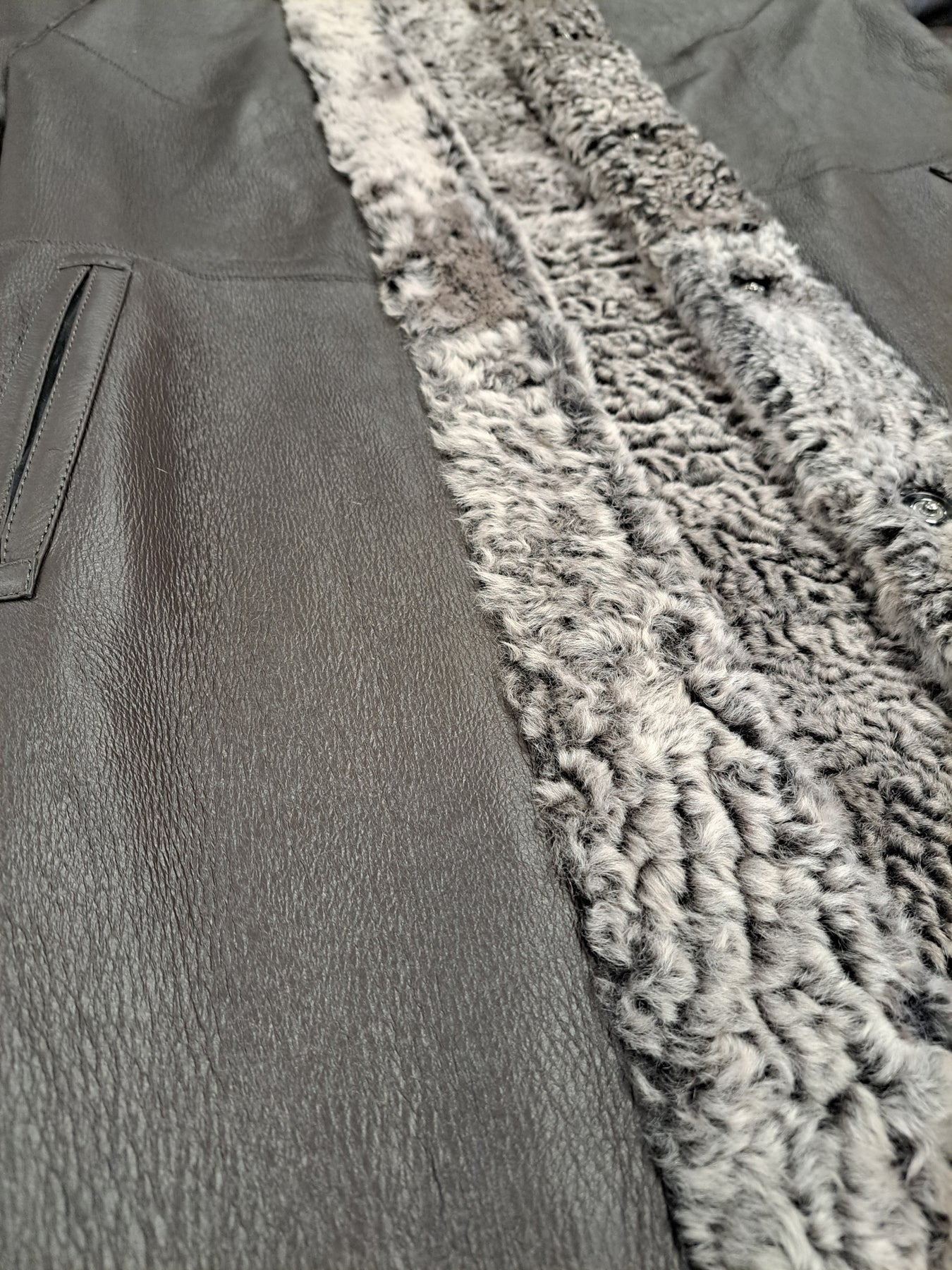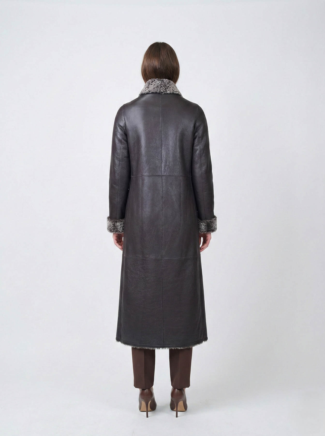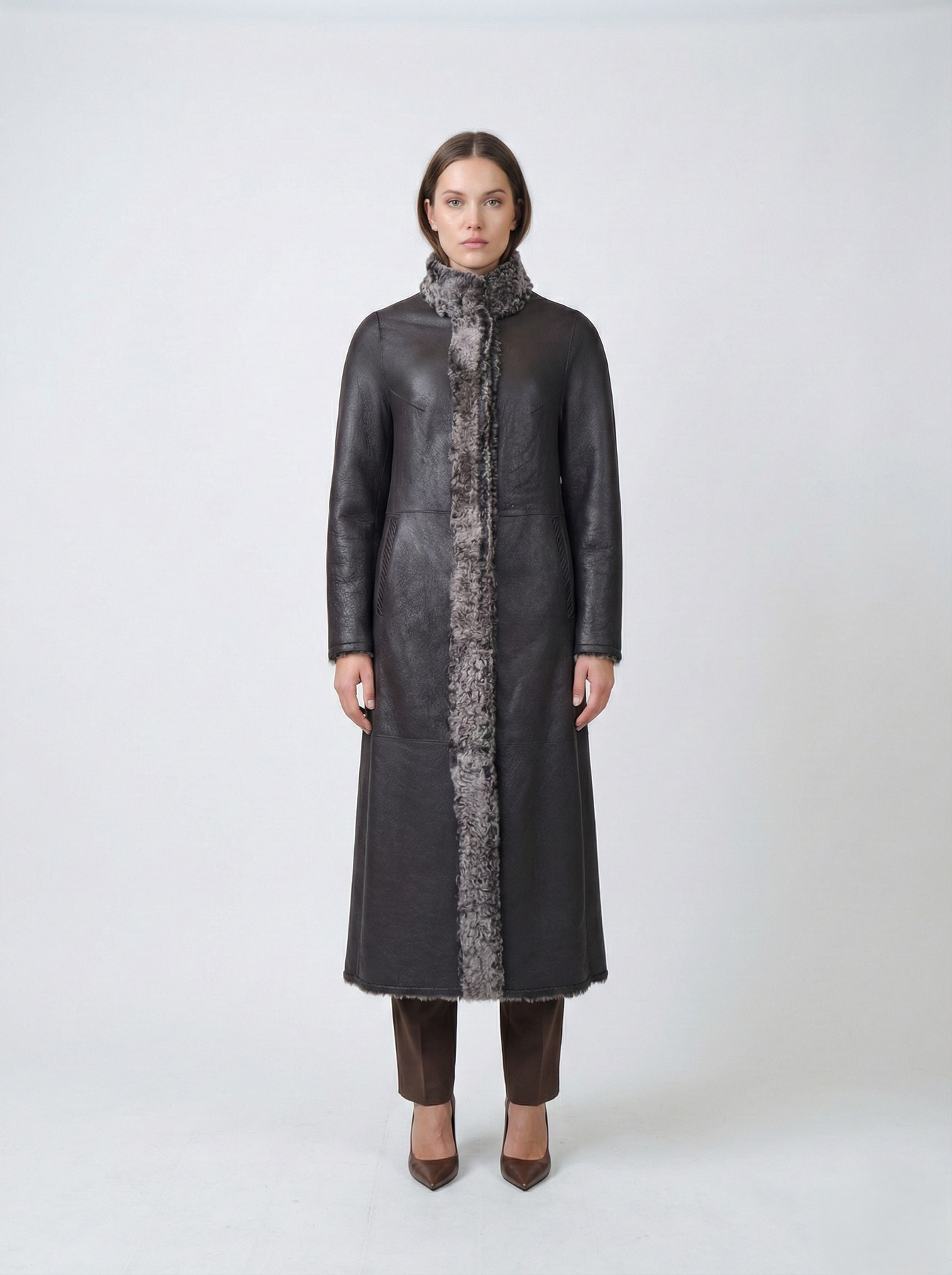 This versatile, reversible 125 cm. shearling lacoon coat is designed to keep you warm and stylish. The cool side vent with zipper and stand up collar add functionality, while the lamb fur material allows your body to breathe. Upgrade your winter wardrobe with the elegant dark brown color of La Coon Lamb.
