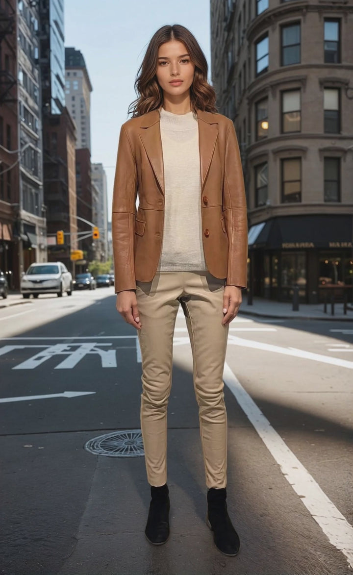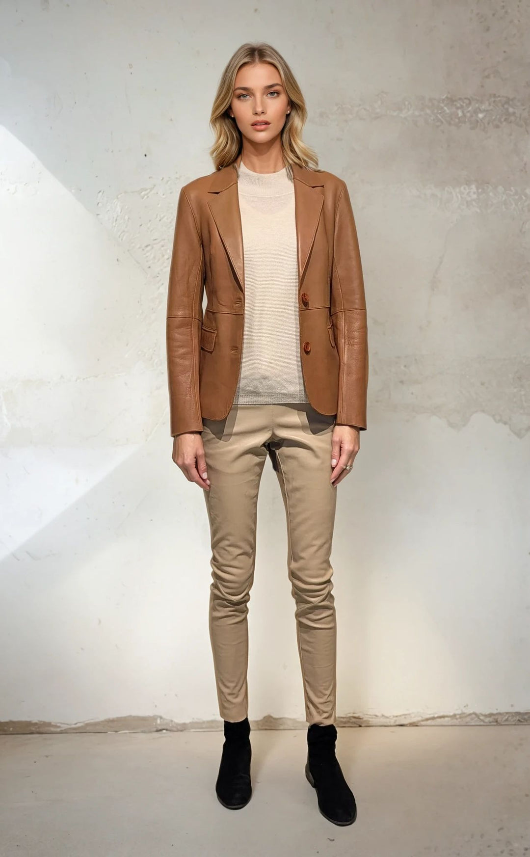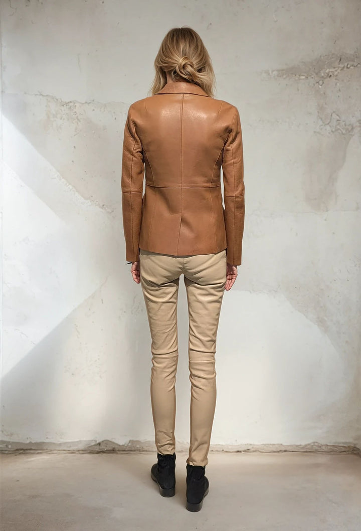 Introducing Nina, the 64 cm woman blazer jacket made of luxurious lamb skin leather. Stay warm and stylish with the soft and comfortable ponding lining inside. Elevate your wardrobe with this timeless caramel jacket.