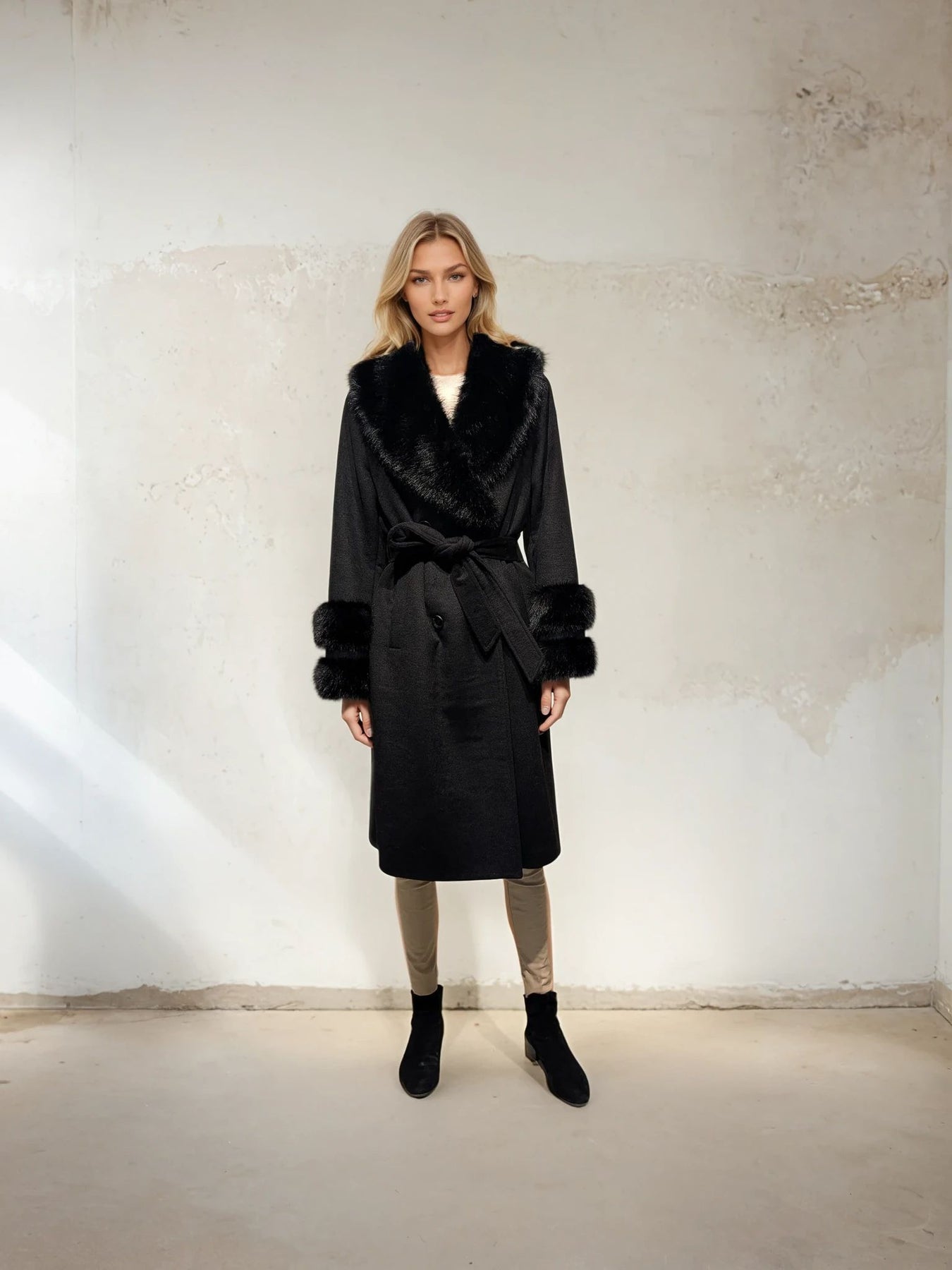 Håll dig varm och snygg med Ivanna, ullkappan på 105 cm för kvinnor. Fuskpälskragen och ärmsluten ger en touch av lyx, medan knytbältet snäpper fast midjan för en smickrande passform. Perfekt för alla tillfällen, den här eleganta svarta kappan kommer att vara din absolut nödvändigaste vinter.