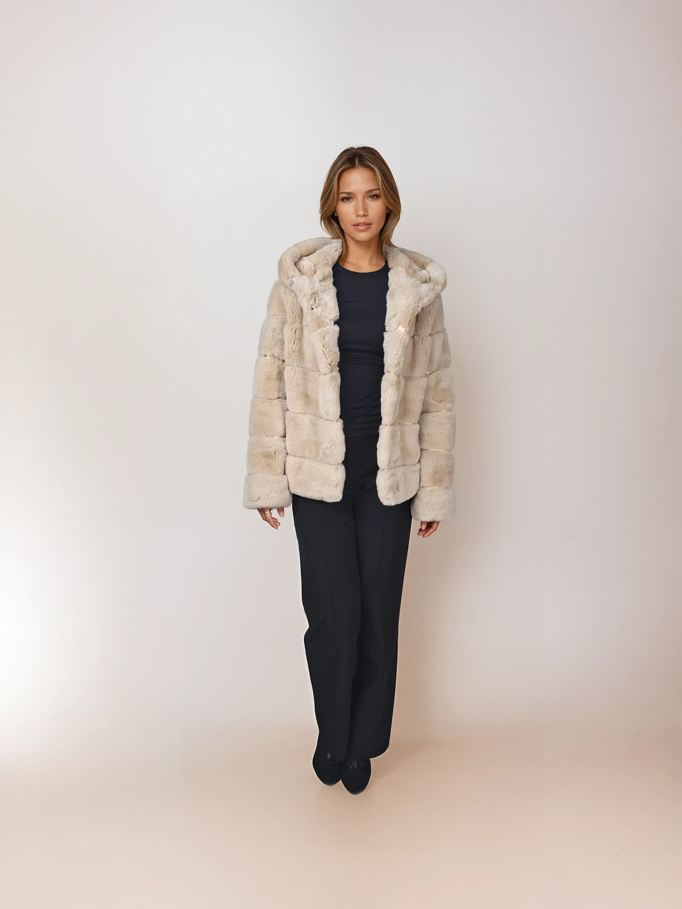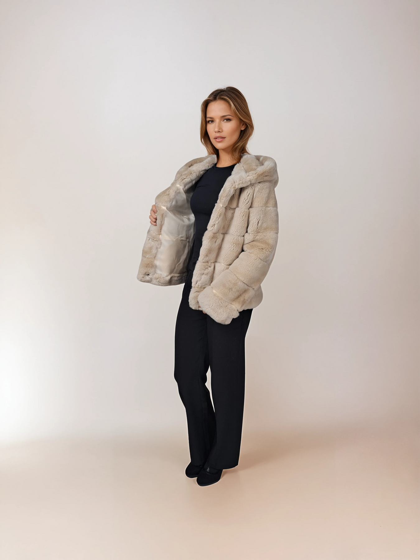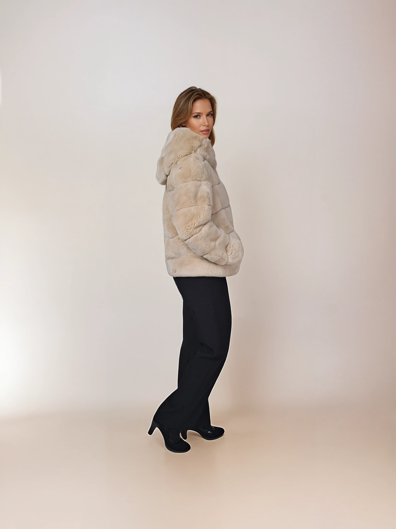 Stampe Danmark introducerar Petrovski, 60 cm, huva Rex Coat for Women i kräm – en perfekt blandning av snygghet, klassisk stil och sportig sofistikering. Den här korta kappan är gjord av vacker svart rex-kaninpäls och är designad för att hålla dig varm under hela vintersäsongen.