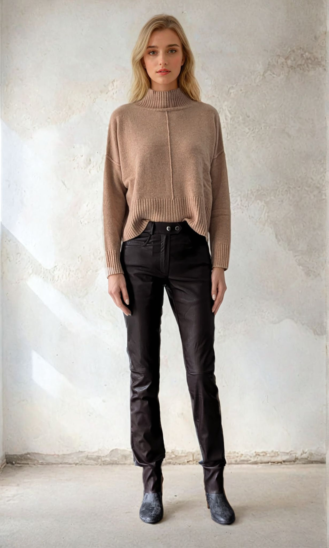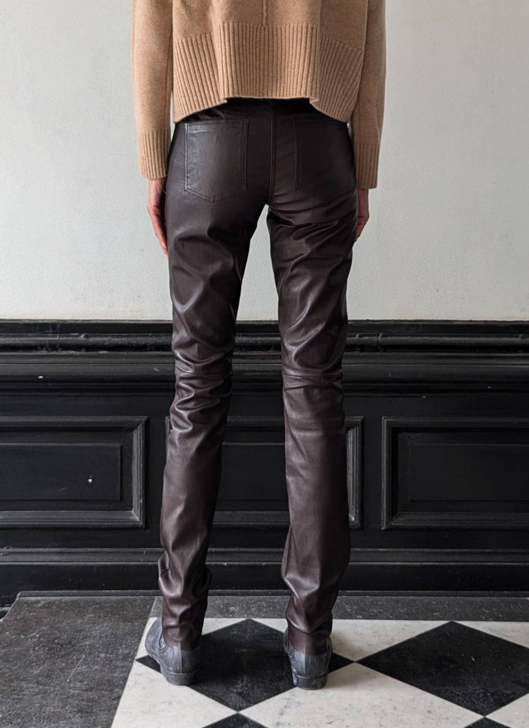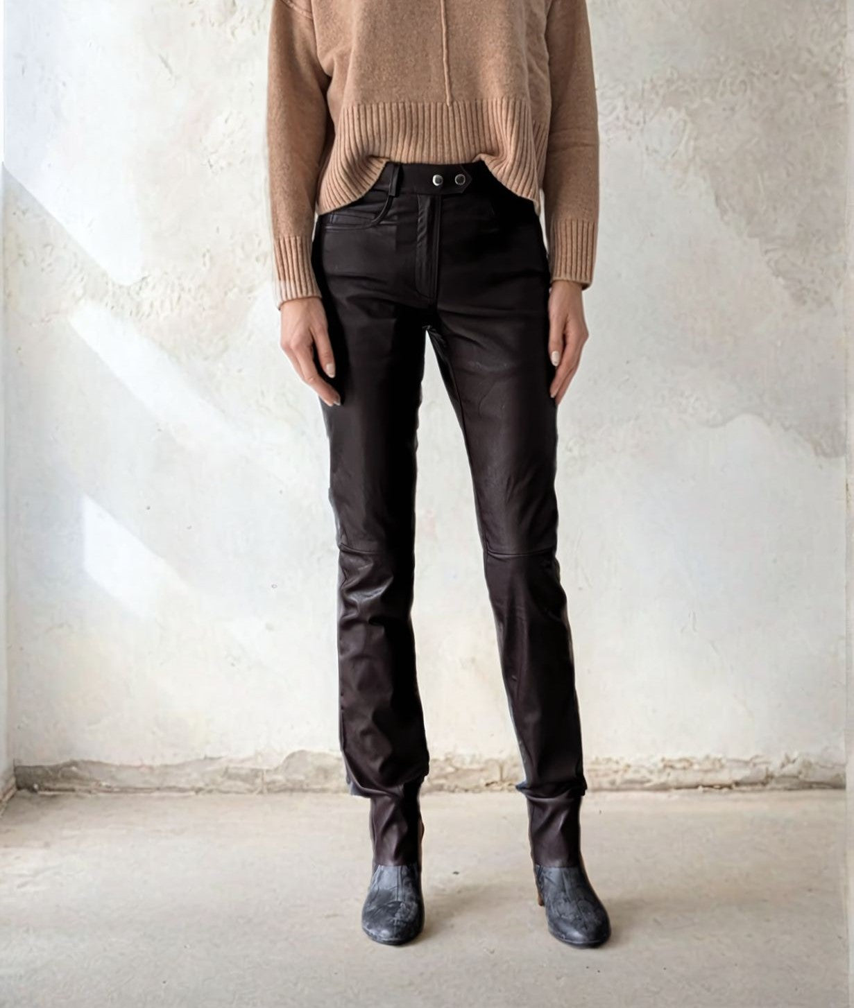 Stretchbyxor i lammskinn för kvinnor med ett innerfoder för ökad komfort. Dessa byxor är designade i en rik brun färg och erbjuder en elegant och snygg passform samtidigt som de ger flexibilitet och hållbarhet. Idealisk för både vardags- och högtidskläder.
