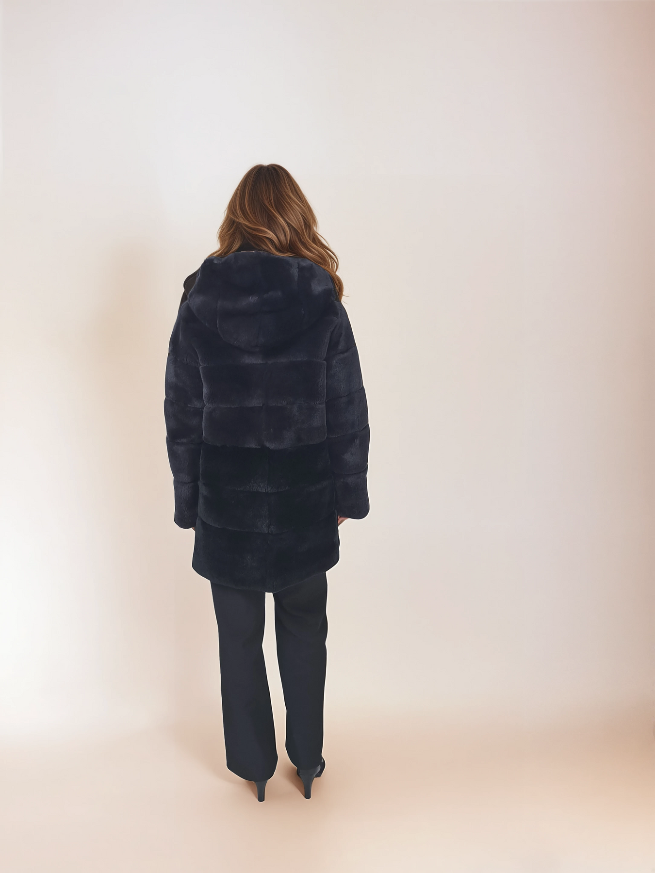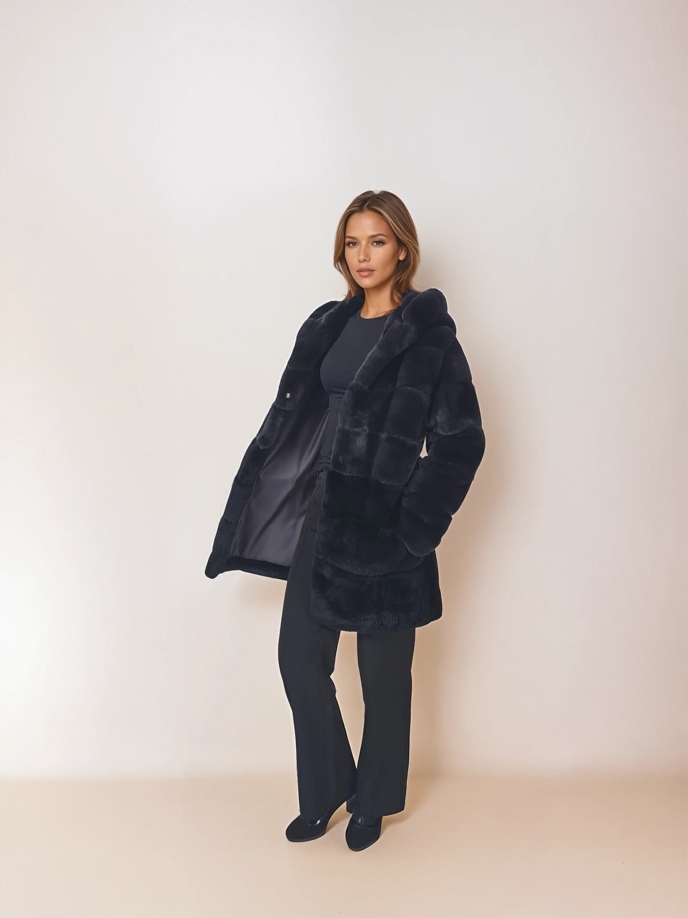 Imelda-jackan exemplifierar diskret lyx med sin tvåfärgade Rex-kaninkonstruktion. Denna 80 cm bit blandar sömlöst kol och svart i en sofistikerad palett som utstrålar tidlös elegans. Det överdådiga Rex-kaninmaterialet ger exceptionell mjukhet och en raffinerad estetik, medan tvåfärgskompositionen ger ett subtilt visuellt djup. Perfekt för kvinnan som letar efter investeringsprylar som överskrider säsonger, den här jackan ger kompromisslös komfort och polerad stil för alla tillfällen.
